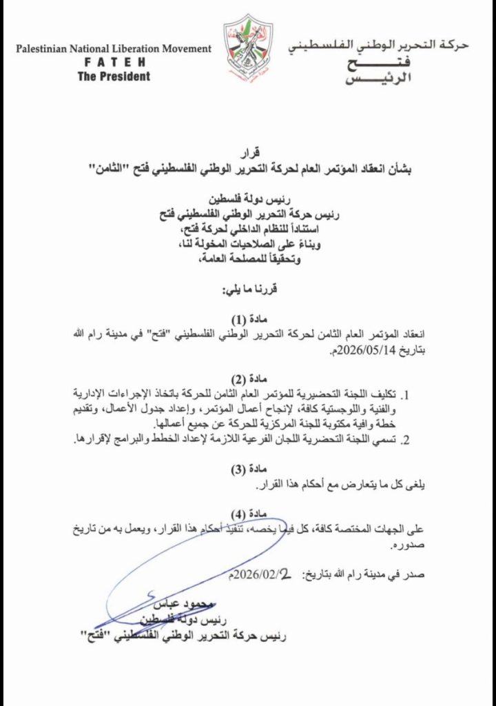 أصدر الرئيس محمود عباس، بصفته رئيس حركة فتح، قرارًا يقضي بعقد المؤتمر العام الثامن للحركة في مدينة رام الله، بتاريخ 14 أيار/مايو 2026، استنادًا إلى النظام الداخلي للحركة والصلاحيات المخولة له.