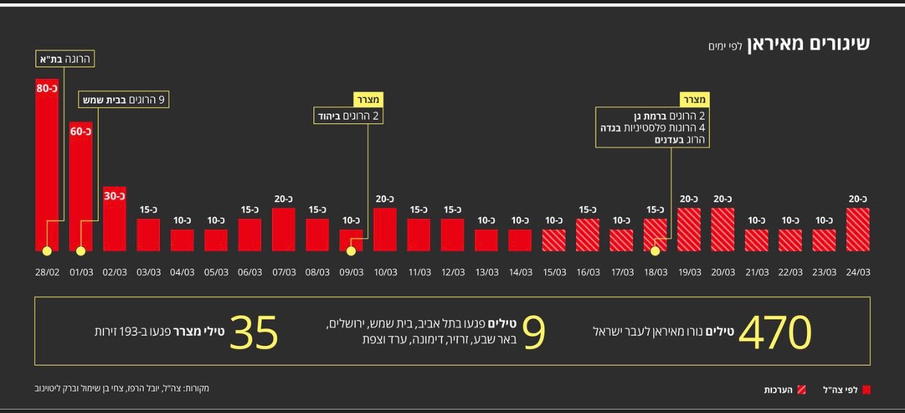 ووفق المعطيات، أطلقت إيران نحو 470 صاروخًا باتجاه إسرائيل منذ بدء المواجهة، حيث سُجلت ذروة الإطلاق في الأيام الثلاثة الأولى بنحو 170 صاروخًا، قبل أن تنخفض الوتيرة لاحقًا إلى معدل يومي تراوح بين 10 و15 صاروخًا. غير أن الأيام الأخيرة حملت تصعيدًا جديدًا، إذ ارتفع عدد الصواريخ المطلقة مجددًا، ووصل إلى نحو 20 صاروخًا في يوم واحد.