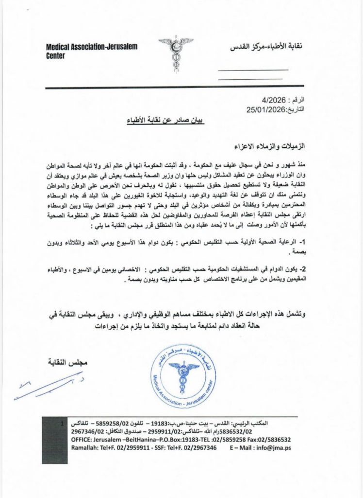 وشددت نقابة الأطباء على أن خطواتها التصعيدية تأتي دفاعاً عن كرامة الأطباء وحقوقهم المهنية، مؤكدة أن باب الحوار لا يزال مفتوحاً، لكنه مشروط بتحقيق المطالب المشروعة، محمّلة الحكومة المسؤولية الكاملة عن تدهور الواقع الصحي في ظل تجاهل الاتفاقات السابقة وسياسات التقليص التي طالت القطاع الصحي.
